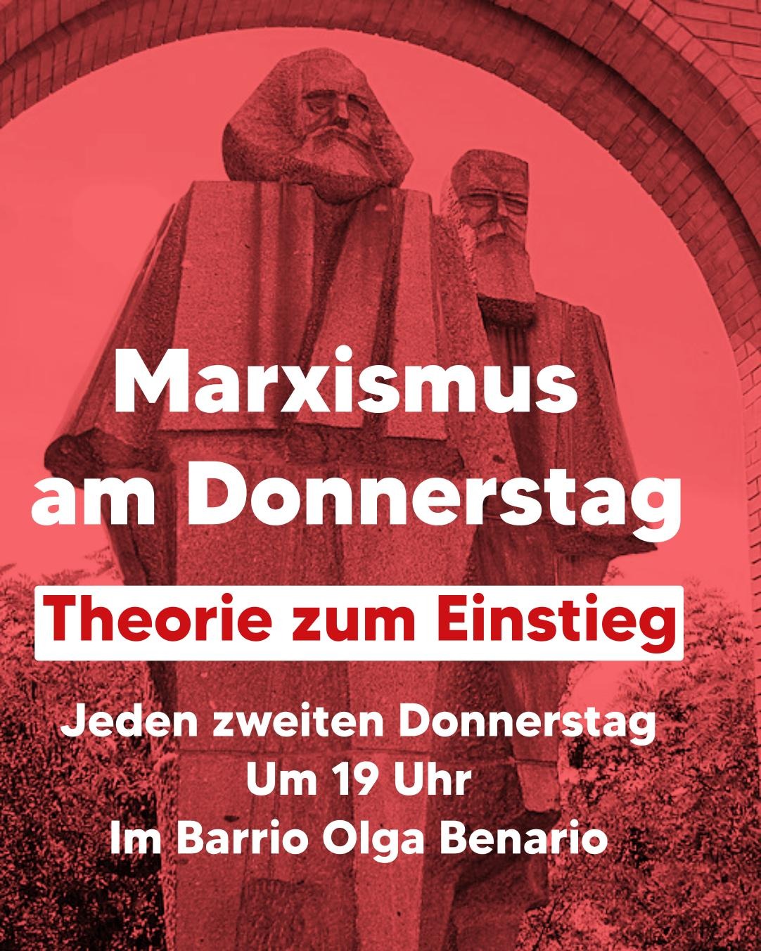 Vom historischen Materialismus über Krisen bis hin zum Patriarchat wird in 45 bis 90 minütigen Vorträgen marxistische Theorie vorgestellt. Jeden zweiten Donnerstag im Barrio Olga Benario, mit interessanten Leuten und anschließender Diskussion. Kommt vorbei und lernt neue und alte Ideen kennen!
