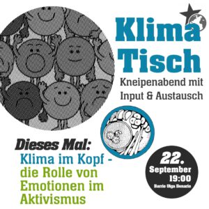 Auf die Klimakrise reagieren wir alle mit ganz verschiedenen Emotionen und Reaktionen. Manche verdrängen sie, andere sind vom Tatendrang erfüllt. Doch warum ist das so? Zu diesem KlimaTisch geht es um die Psychologie im Aktivismus. Was steckt hinter unseren Emotionen und wie können wir sie nutzen?