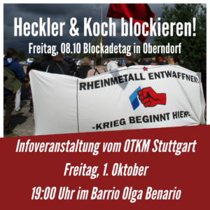 Alle Infos zu den Protesten vor Ort und warum es so wichtig ist, gegen den deutschen Imperialismus und Kriegsprofiteure aktiv zu werden, wird das OTKM Stuttgart am Freitag um 19:00 im Barrio Olga Benario berichten! Hier gibt es auch alle Infos zu Anreise aus München und ihr könnt euch einen Platz reservieren.